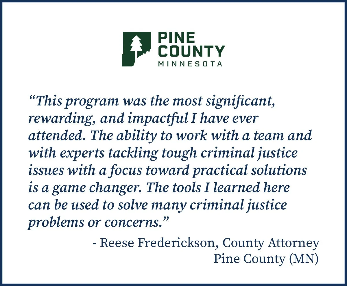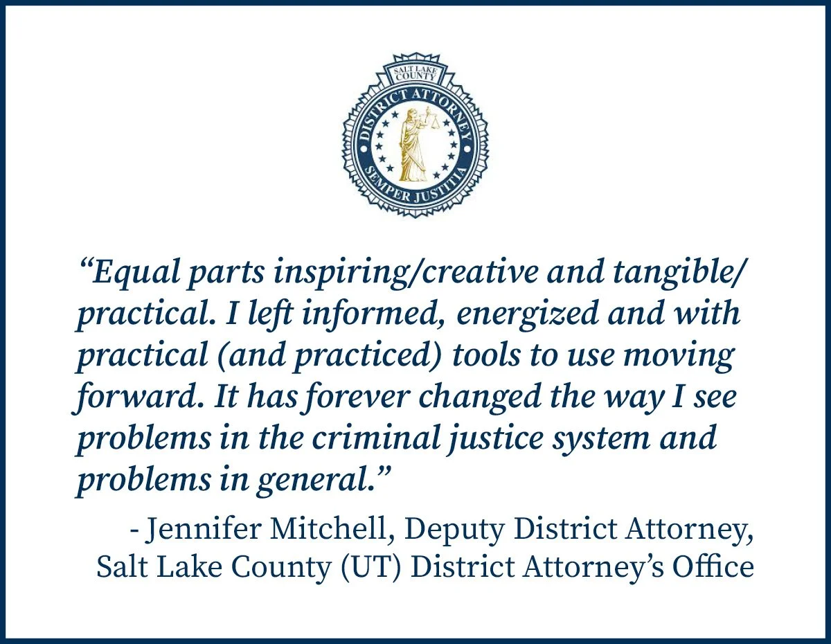 This 12-month experience has been designed with intentionality to make sure you and your office are supported and set up to succeed in solving one of your community’s challenges – we also want you to have fun while doing it. Our team has deep experience in the criminal justice system and have walked in your shoes. We want to provide you with a place to find clarity on the problem you are solving and then give you the tools to solve it.