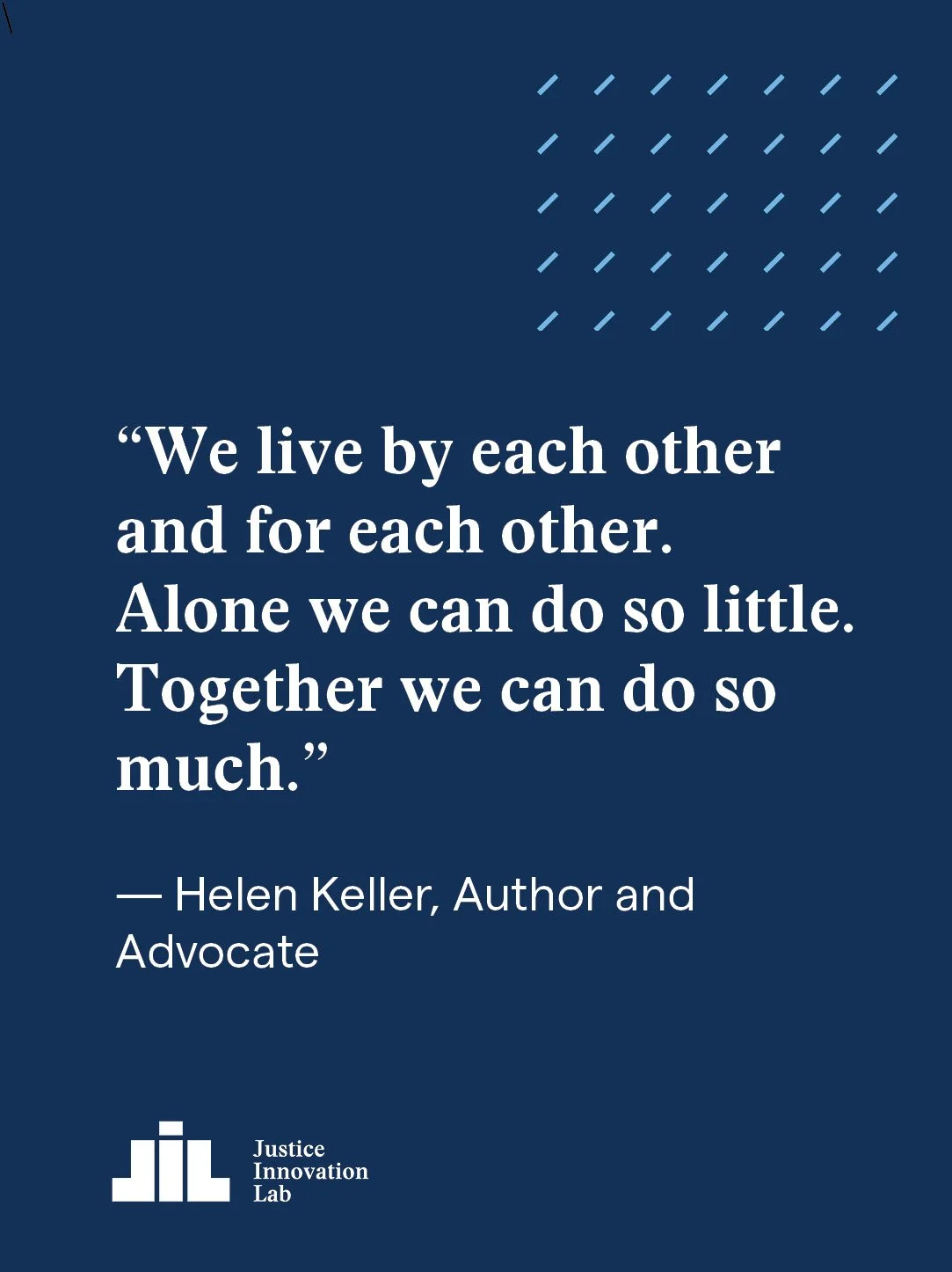 Justice Innovation Lab encourages partner jurisdictions to work collaboratively with a wide range of actors who are impacted by their decisions to better understand and solve the problems facing their communities.